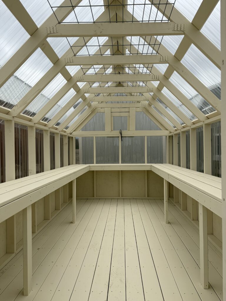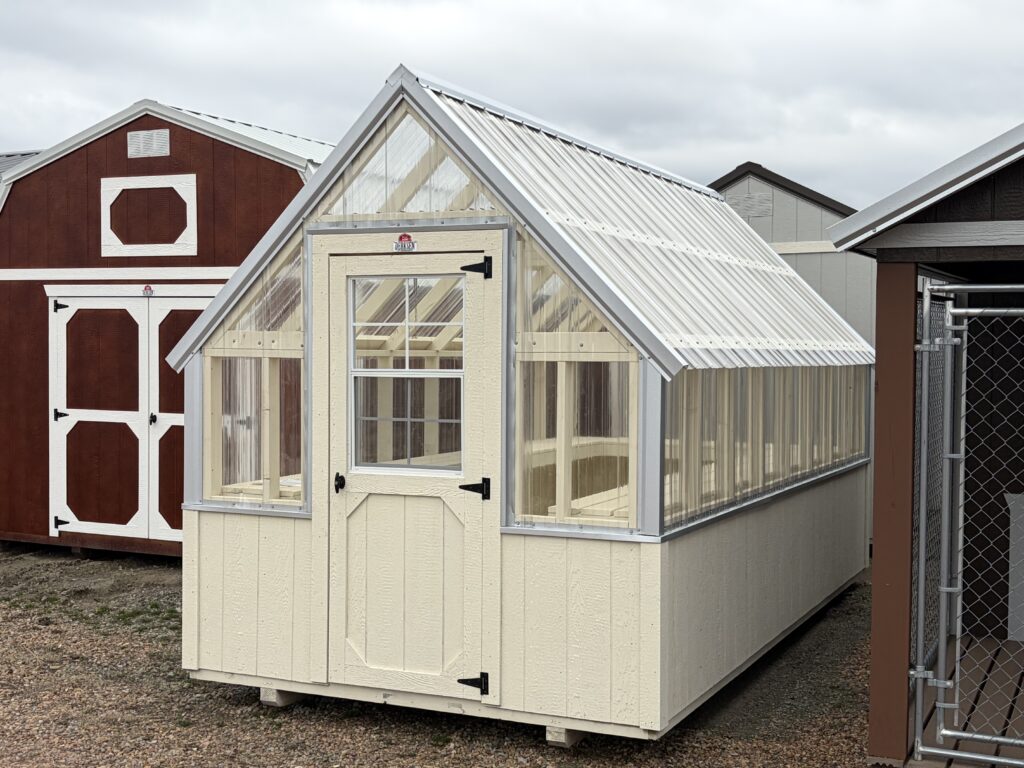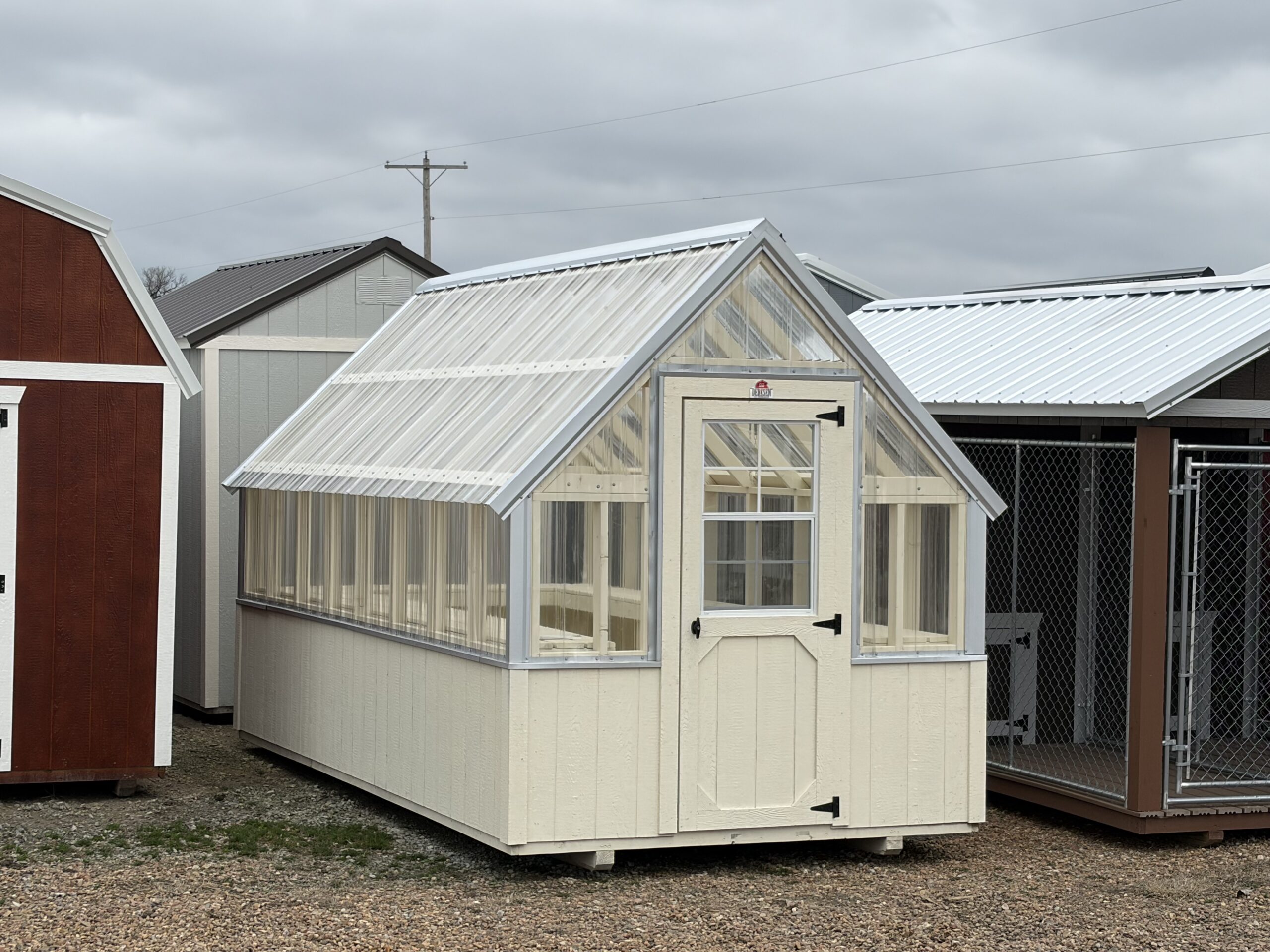 Spacious Seminole White greenhouse! Has a sturdy frame clear corrugated panels for lots of light. Inside has built-in wooden shelves all around and a solid wood floor. Perfect for starting all your plants or just chillin with your green friends!
